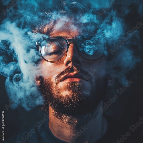Bearded Man in Glasses Surrounded by Dreamlike Blue Smoke, Evoking a Sense of Serenity, Imagination, and Contemplation, in a Mysterious and Atmospheric Setting of Vapor and Shadows