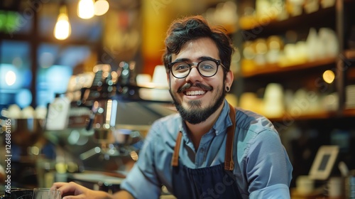 Bearded man wearing glasses and apron standing in a coffee shop, smiling at the camera.