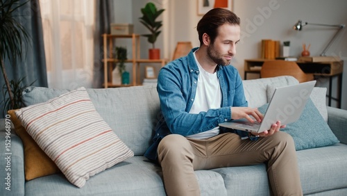 Bearded man working with laptop sitting on sofa. Male sitting on couch and working distantly. Man working online. Male freelancing. Man pressing buttons on keyboard of laptop.