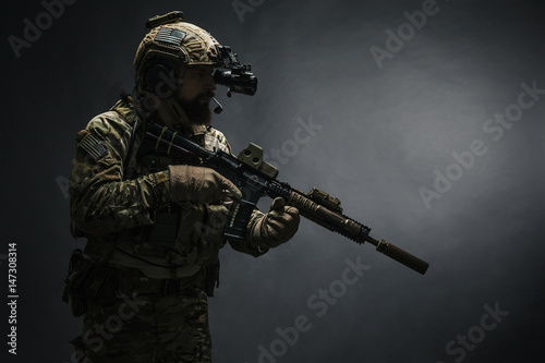 Bearded soldier in Combat Uniforms with weapon, plate carrier and combat helmet are on. Studio shot, dark background