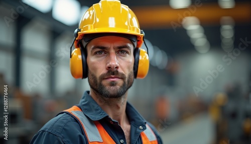 Bearded white man working in heavy industry with protective gear in industrial environment