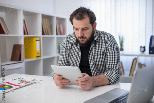 Bearded young man in office working on digital tablet alone