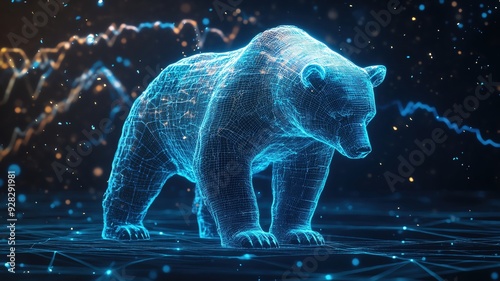 Bearish trade strategy, holographic bear icon, resilient investment approach, futuristic market analysis