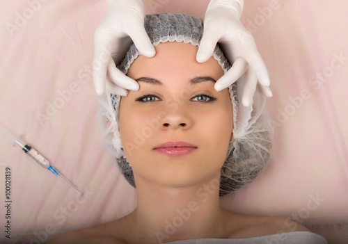 Beautician examining the face of a young female client at spa salon. Professional consultation.
