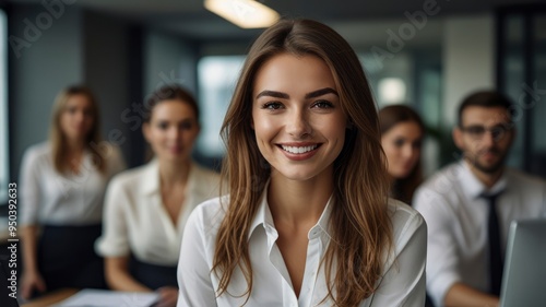 Beautiful woman smiling with blur teammates working in modern office, looking at camera