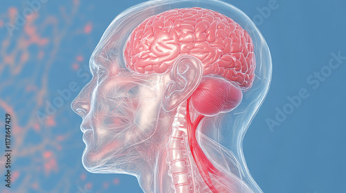 beautiful, A detailed illustration of the human head with transparent skin, showing the brain and neck area, highlighted in red to represent pain or injury. The background is blue for contrast.