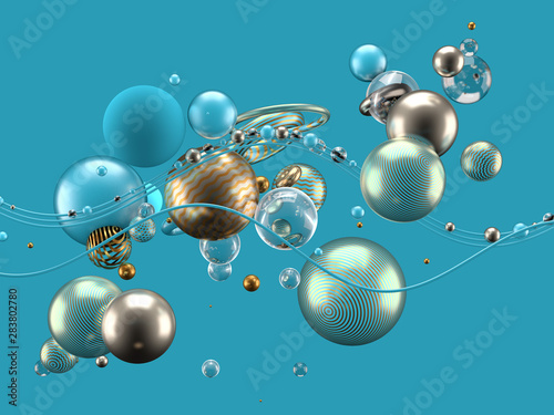 Beautiful abstract background with volume elements, balls, texture, lines. 3d illustration, 3d rendering.