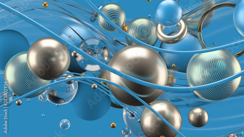 Beautiful abstract background with volume elements, balls, texture, lines. 3d illustration, 3d rendering.
