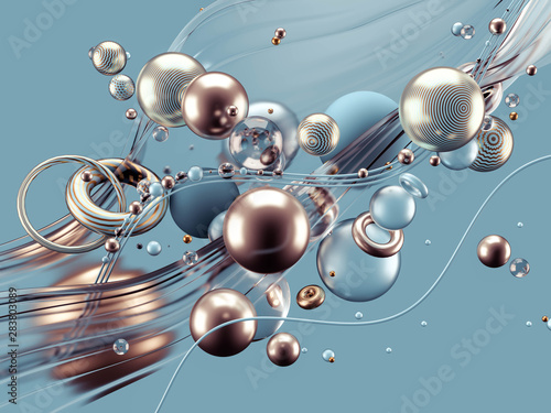 Beautiful abstract background with volume elements, balls, texture, lines. 3d illustration, 3d rendering.