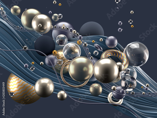 Beautiful abstract background with volume elements, balls, texture, lines. 3d illustration, 3d rendering.