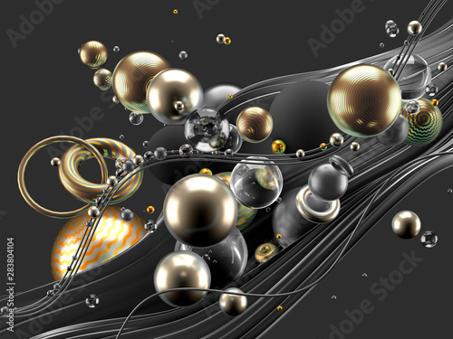 Beautiful abstract background with volume elements, balls, texture, lines. 3d illustration, 3d rendering.