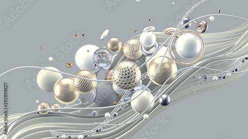 Beautiful abstract background with volume elements, balls, texture, lines. 3d illustration, 3d rendering.