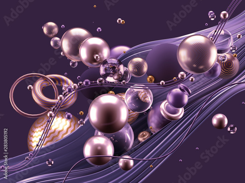 Beautiful abstract background with volume elements, balls, texture, lines. 3d illustration, 3d rendering.