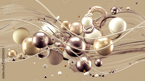 Beautiful abstract background with volume elements, balls, texture, lines. 3d illustration, 3d rendering.