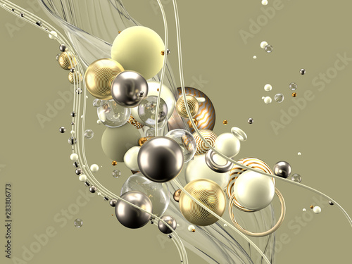 Beautiful abstract background with volume elements, balls, texture, lines. 3d illustration, 3d rendering.