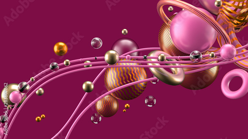 Beautiful abstract background with volume elements, balls, texture, lines. 3d illustration, 3d rendering.