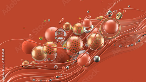 Beautiful abstract background with volume elements, balls, texture, lines. 3d illustration, 3d rendering.