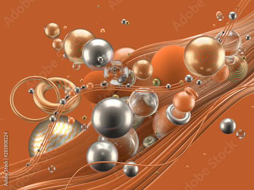 Beautiful abstract background with volume elements, balls, texture, lines. 3d illustration, 3d rendering.