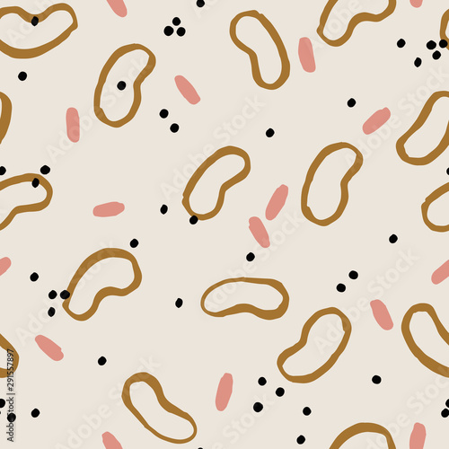 Beautiful abstract texture with cute rounded shapes. Vector seamless pattern with ink shapes, dots and brush strokes. Modern background.