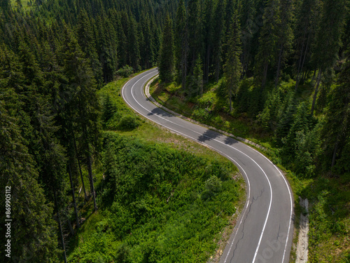 Beautiful aerial view of dense forest mountain landscape in summer time with curvy road cutting through forest. Aerial view by drone . Romania