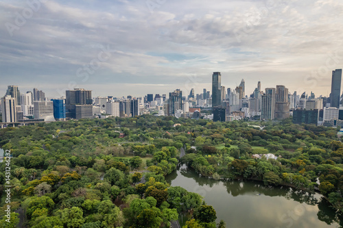 Beautiful aerial view of green park with a city skyline featuring numerous tall buildings in the heart of a metropolis, beneath a cloudy sky.