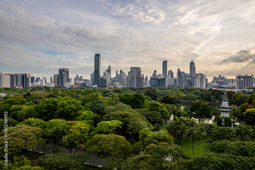Beautiful aerial view of green park with a city skyline featuring numerous tall buildings in the heart of a metropolis, beneath a cloudy sky.
