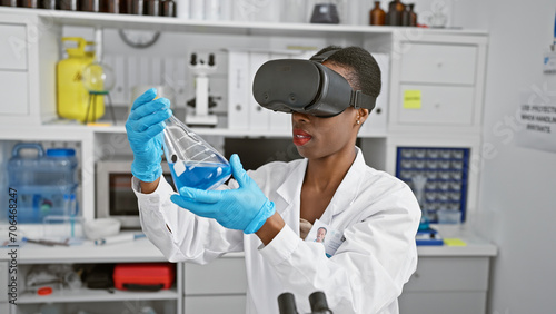 Beautiful african american woman scientist engrossed in high-tech vr science experiment at lab, measuring liquid in test tube.