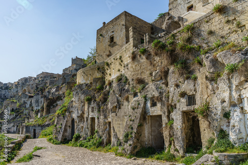 beautiful ancient ghost town of Matera (Sassi di Matera) in beautiful bright sun shine with blue sky, south Italy.