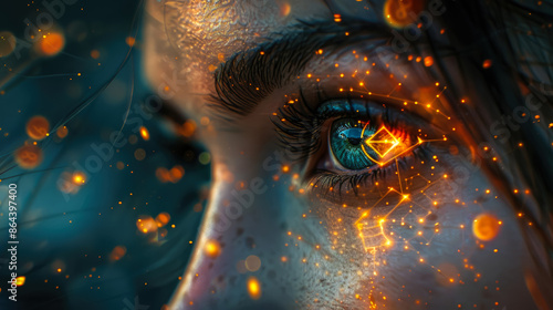 Beautiful and mysterious eye surrounded by glowing numerological symbols, geometric shapes. Fascinating appearance, and symbols and figures create sense of ancient wisdom and mysticism.