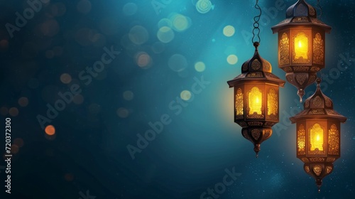 Beautiful Arabic lantern with lit candle hanging on a tree with blue out of focus background. ramadan concept, arabia