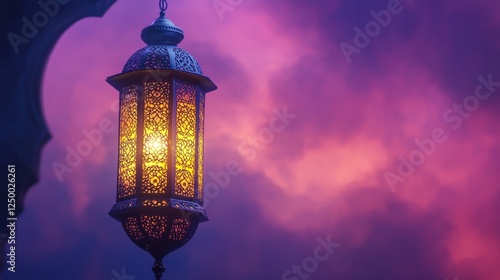 Beautiful arabic lantern with warm glow, celebrating ramadan in a traditional style, set against a softly blurred background with festive decorations for a cozy and spiritual atmosphere