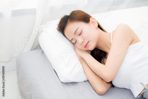 Beautiful asian young woman sleeping lying in bed with head on pillow comfortable and happy. girl with relax for health concept.