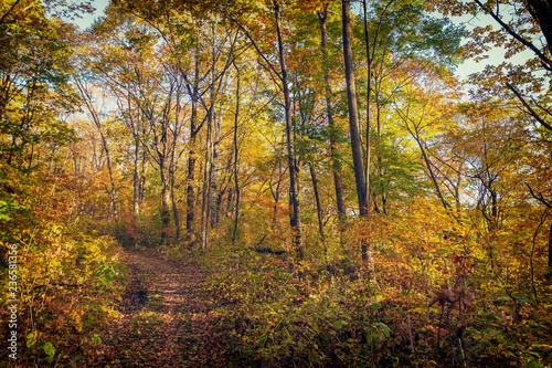 Beautiful autumn forest with colorful trees and a narrow path