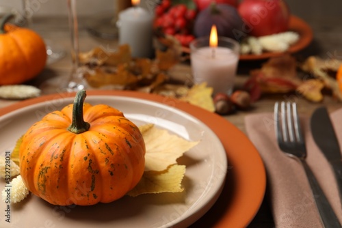 Beautiful autumn place setting and decor on table, closeup. Space for text