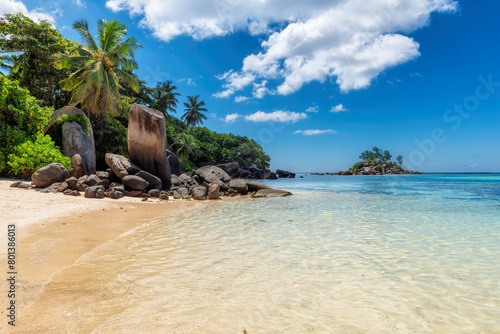 Beautiful beach in Seychelles island. Coconut palms, beautiful rocks and tropical sea.