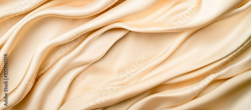 Beautiful beige satin silk background with soft drapery and wavy folds. Top view