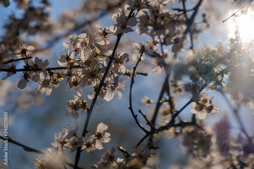Beautiful blooming apple tree branch with sun. Sunbeams lights through branches.