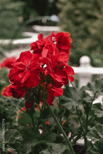 Beautiful blooming red pelargonium in the garden. Red geranium flowers in the summer botanical garden. selective focus.