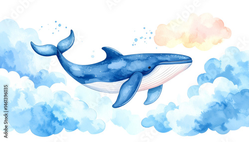 beautiful blue whale swims gracefully through soft, fluffy clouds, creating whimsical and serene atmosphere. watercolor style enhances dreamy quality of this enchanting scene