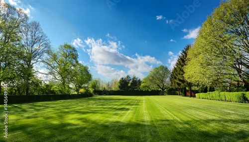 beautiful blurred background image of spring nature with a neatly trimmed lawn surrounded by trees against a blue sky with clouds on a bright sunny day