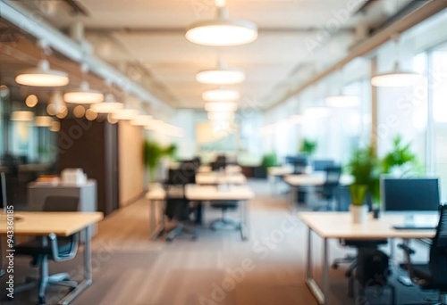 Beautiful blurred background of a light modern office interior with panoramic windows and beautiful lighting, ai