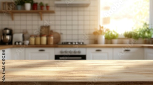 beautiful brown Empty wood table top kitchen interior background and blurred defocused with daylight flare bokeh.