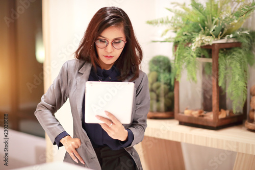 beautiful businesswoman portrait with glasses using tablet (this image for business and technology background concept)