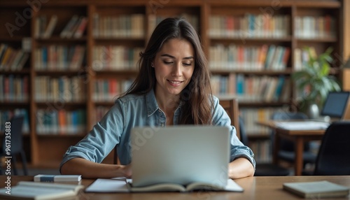 Beautiful Caucasian Female Student Working on a Laptop Computer in the Library.