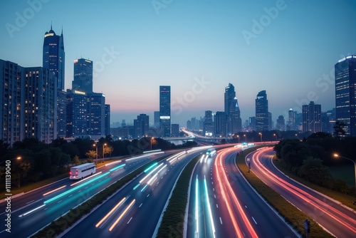 Beautiful city skyline at twilight featuring vibrant traffic light trails and modern skyscrapers under a dusky sky with hints of artificial intelligence influence in urban planning