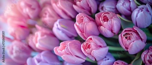 Beautiful close up bouquet of lilac tulips close up banner background for spring women's holidays.