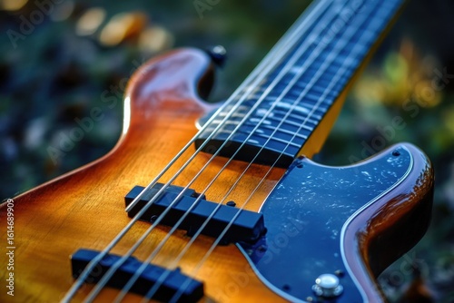 Beautiful close-up of a beautifully crafted electric guitar in natural light outdoors, Thumping Bass Speakers Wall