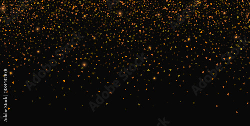 Beautiful confetti from bright golden hearts falling on a dark background. Vector illustration.
