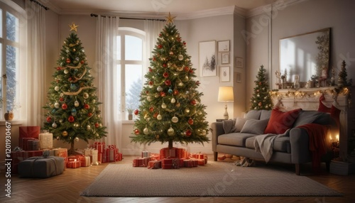 Beautiful decorated Christmas tree in a cozy living room with ornaments and lights, festive atmosphere, festive decor