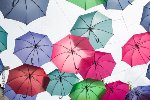Beautiful display of colorful hanging umbrellas in a outdoor, Colorful hanging umbrellas on white sky background in Sunny day